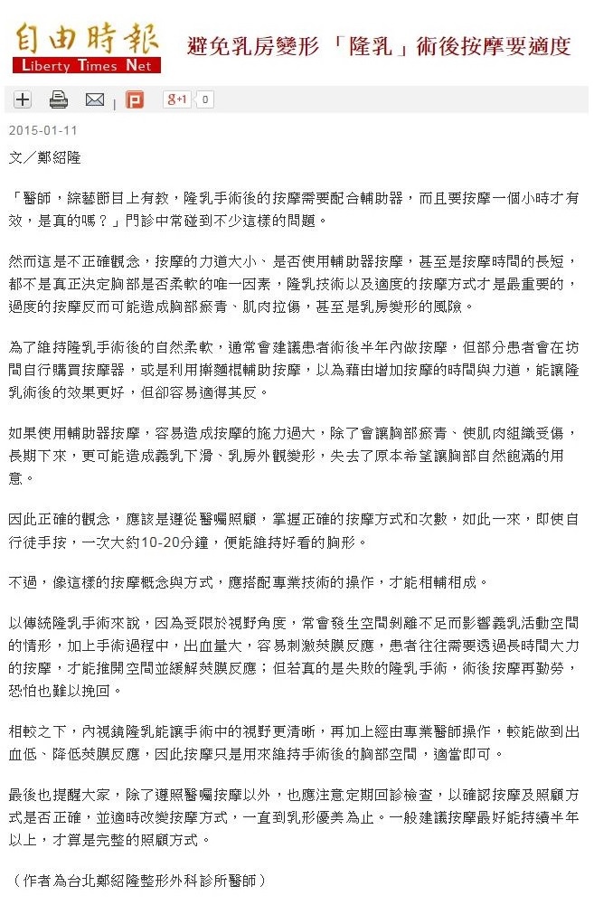 【自由時報】避免乳房變形 「隆乳」術後按摩要適度