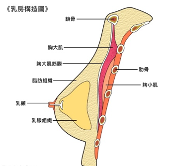 ↑胸部的層次從外向內依序是皮膚、皮下脂肪、乳腺、筋膜、胸肌、肋骨、胸腔。